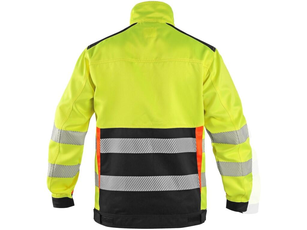 Pánská výstražná blůza, ramena zesílena materiálem CORDURA, rukávy s nastavitelnou manžetou na suchý zip, kryté zapínání na zip, suché zipy a druky, levá náprsní kapsa na zip, pravá krytá klopou, v pravé kapse odnímatelné pouzdro na ID kartu, na levém rukávu kapsička na tužky, boční kapsy na zip, segmentované reflexní pásky (šíře 5 cm), kontrastní žluté/oranžové a reflexní doplňky. Doporučené použití: stavebnictví, silničáři, údržba, logistika, letecká a lodní doprava.