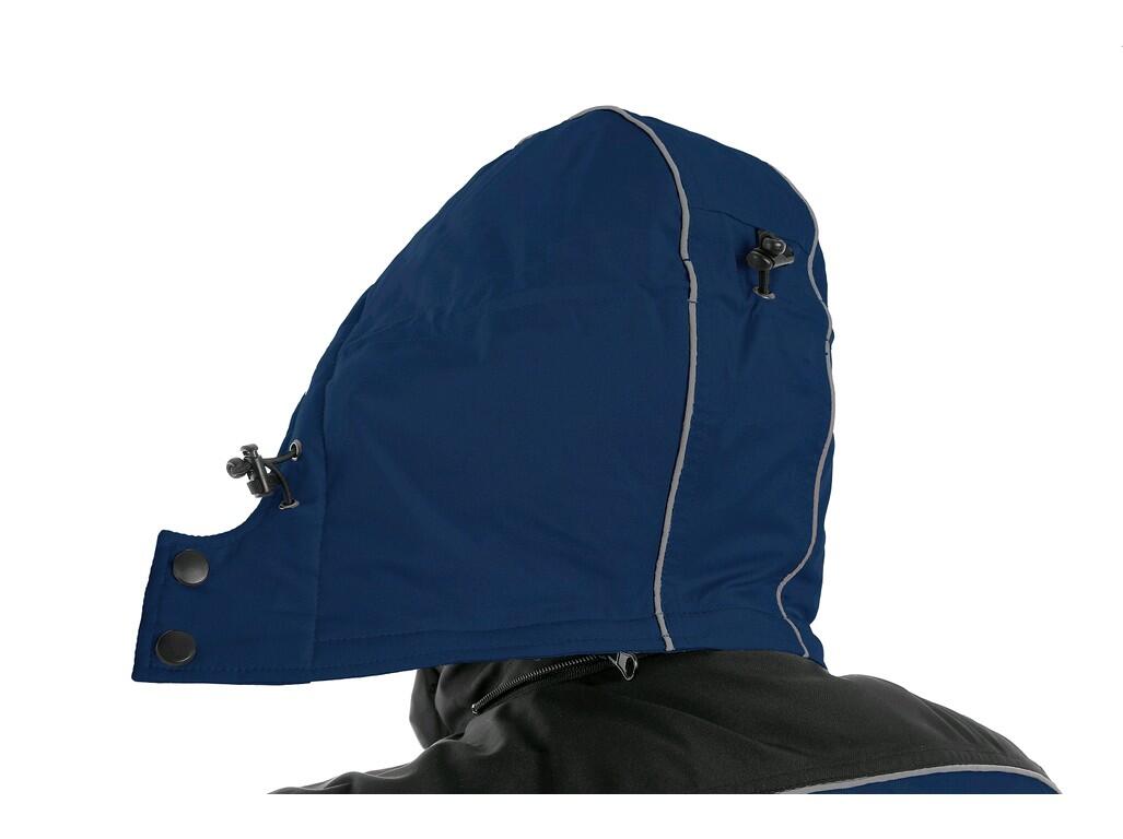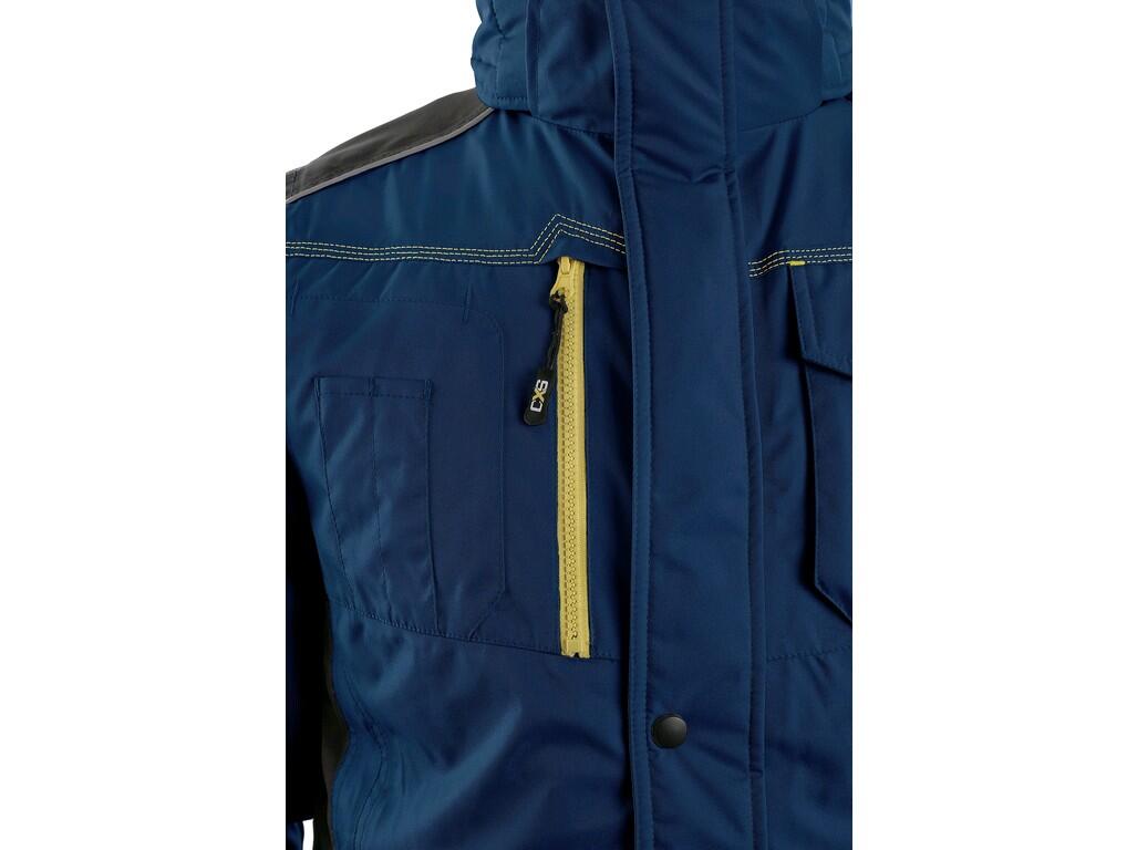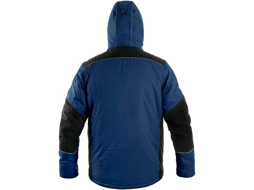 Pánská zateplená bunda, odolná proti vodě a větru, kryté zapínání na zip, odepínací kapuce, vnitřní manžety v rukávech, plastové poutko pod náprsní kapsou, stahování v dolním okraji, lepené švy, TPU membrána, reflexní doplňky. Náprsní kapsy na zip nebo druky, 2 boční kapsy na zip, 3 vnitřní kapsy.