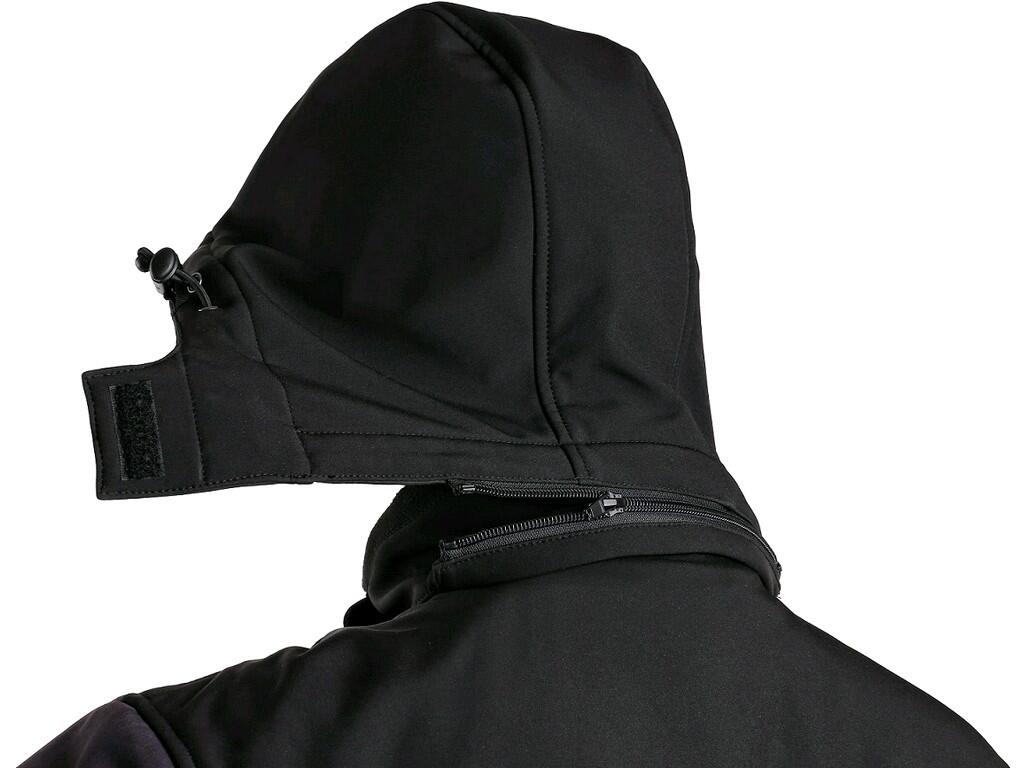 Pánská softshellová bunda s odepínací kapucí, odolná proti vodě a větru, zapínání na zip, větrání v podpaží, rukávy s regulovatelnými manžetami, náprsní kapsa na zip, stahování v dolním okraji, 2 boční kapsy na zip, reflexní doplňky, TPU membrána, odolnost materiálu proti průniku vody 10 000 mm mimo oblast švů, paropropustnost 3 000 g/m2/24h.