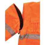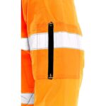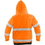 Výstražná zateplená bunda do pasu, 2v1, odolná proti vodě a větru, reflexní pruhy, lepené švy, zapínaná na zip krytý légou, odepínací rukávy s regulovatelnými manžetami, kapuce v límci, fleecový vnitřní límec, v délce pružný pas, na levém rukávu kapsa na zip, 2 spodní kapsy, dvě náprsní kapsy kryté patkou na suché zipy, na pravé straně našitá malá kapsa na mobil a 3 tunely na tužky, na levé straně poutko na přichycení ID karty, jedna vnitřní kapsa. Uvnitř je zip pro snadnou aplikaci výšivky na vnější stranu bundy. Doporučené použití: stavebnictví, silničáři, řidiči, logistika, údržba, popeláři, záchranáři, v zimě a mokrém prostředí, dělníci.