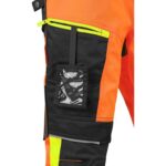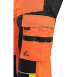 Pánské výstražné kalhoty, pas s poutky na opasek a gumou v bocích, 2 přední kapsy, 2 zadní kapsy, jedna s klopou, kryté přední zapínání na zip, boční multifunkční kapsy, stehenní zipová kapsa s vnitřním pouzdrem na ID kartu, kolena zesílena materiálem CORDURA s možností vložení kolenních výztuh, spodní část nohavic vyztužena materiálem CORDURA, segmentované reflexní pásky (šíře 7 cm), kontrastní žluté/oranžové a reflexní doplňky. Doporučené použití: stavebnictví, silničáři, údržba, logistika, letecká a lodní doprava.