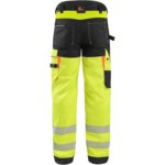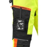 Pánské výstražné kalhoty, pas s poutky na opasek a gumou v bocích, 2 přední kapsy, 2 zadní kapsy, jedna s klopou, kryté přední zapínání na zip, boční multifunkční kapsy, stehenní zipová kapsa s vnitřním pouzdrem na ID kartu, kolena zesílena materiále