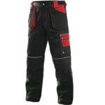 Pánské zateplené kalhoty, pevný pas vzadu do gumy s poutky na opasek, zdvojená kolena s možností vložení kolenních výztuh, našité kapsy, klínové přední kapsy a zasunovací odnímatelné kapsy na zip s poutky na nářadí, reflexní doplňky.