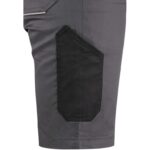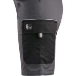 Dámské montérkové kraťasy z lehkého materiálu, pas s poutky na opasek a gumou v bocích, přední klínové kapsy, boční kapsa s klopou, kapsa na skládací/svinovací metr, zadní jednoduchá kapsa na pravé straně, reflexní doplňky.
