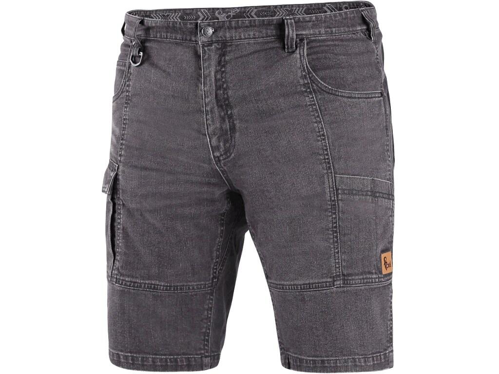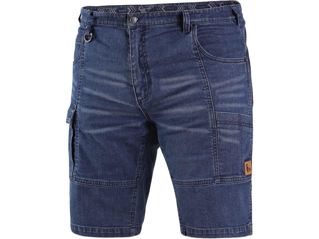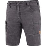 Pánské džínové kraťasy, pas s poutky na opasek a plastovým přívěskem, 2 přední kapsy, 2 zadní kapsy z materiálu CORDURA, boční multifunkční kapsy, na pravé kapse poutko pro kladivo.