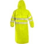Výstražný plášť s reflexními pruhy, nepromokavý, lepené švy, odepínací kapuce v límci, zapínání na zip krytý légou, raglánové rukávy v manžetě do gumy, dvě spodní kapsy s patkou, větrání na zádech a v podpaží. Plášť je složen v praktickém balení na zip. Délka pláště 120 cm.