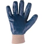 Rukavice s bavlněnou vložkou máčené v modrém nitrilu s úpletovou manžetou.