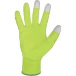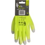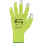 Pletené bezešvé rukavice, dlaně a prsty povrstveny polyuretanem, pružná manžeta. V koncích palce, ukazováčku a prostředníčku měděné vlákno pro práci s dotykovými displeji. Baleny s blistrem. Doporučené aplikace: automobilový průmysl, elektronika, logistika, skladování, montáž a balení malých součástek, zahrada, lehké montáže.