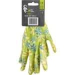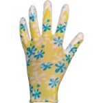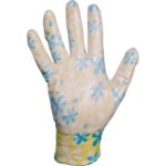 Rukavice s potiskem, dlaň a prsty máčené v nitrilu.
