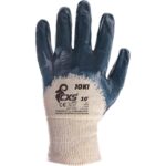 Rukavice polomáčené v modrém nitrilu s úpletovou manžetou. Doporučené použití: olejnaté prostředí, práce s PHM. Odvětví: strojírenství, zemědělství, čerpací stanice.