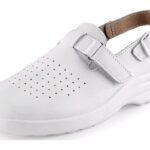 Sandál, dámský, kožený s plnou špicí, perforovaný s přezkou na suchý zip a páskem kolem paty. Materiál: svršek z přírodní úsně, antistatická, protiskluzová PU podešev.
