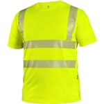 Pánské výstražné tričko s krátkým rukávem, kulatý průkrčník, zpevňující krční páska, boční švy, síťovina v podpaží, segmentované reflexní pruhy: 2 horizontální, 2 vertikální (šíře 5 cm). Doporučené použití: stavebnictví, silničáři, řidiči, logistika, údržba, kolo, motorky, skladování.