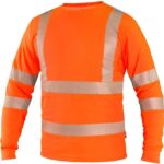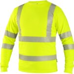 Pánské výstražné tričko s dlouhým rukávem, kulatý průkrčník, zpevňující krční páska, boční švy, síťovina v podpaží, segmentované reflexní pruhy: 2 horizontální, 2 vertikální (šíře 5 cm). Ochranný UV faktor UPF 50.
