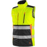 Pánská výstražná zateplená vesta, odolná proti vodě a větru. Vnitřek límce z příjemného fleecu, kryté zapínání na zip a suché zipy, levá náprsní kapsa na zip, pravá krytá klopou, v pravé kapse odnímatelné pouzdro na ID kartu, boční kapsy na zip, segm