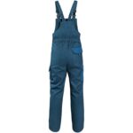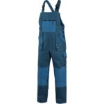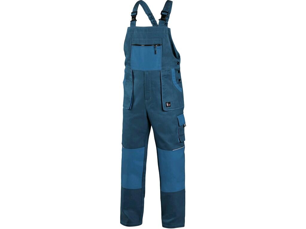 Pánské montérkové kalhoty s náprsenkou, náprsní kapsa na zip, pas vzadu do gumy, přední kapsy, boční kapsa na svinovací / skládací metr, boční kapsa na mobil / peněženku, zdvojená kolena, zadní kapsa s klopou, šle s gumou vzadu, reflexní doplňky. Doporučené použití: stavebnictví, lehký průmysl, logistika, skladová manipulace, autoservisy, údržba, montáže, zemědělství, zahrada, hobby.