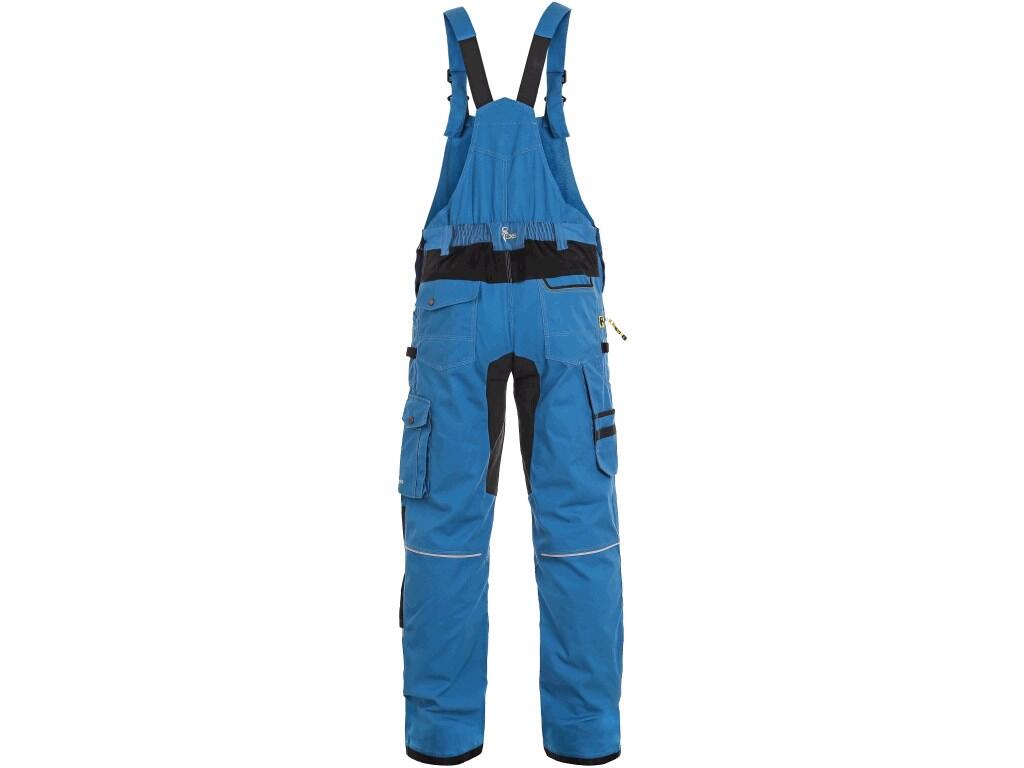 Pánské montérkové kalhoty s náprsenkou, strečová tkanina umožňující volný pohyb, náprsní kapsa s klopou, pas s poutky na opasek, přední kapsy s kapsou na zip, multifunkční kapsy na obou stranách, kolena zesílena 600D polyesterem s možností vložení kolenních výztuh, dvě zadní kapsy – jedna s klopou, zadní spodní lem nohavice vyztužen 600D polyesterem, šle s gumou vzadu, reflexní doplňky. Doporučené použití: strojírenství, stavebnictví, lehký průmysl, automobilový průmysl, logistika, skladová manipulace, spedice, autoservisy, údržba, montáže, zemědělství, zahrada, hobby.